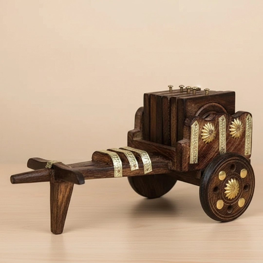 This coaster set is handcrafted by skilled artisans, featuring fine carving, smooth finish, and elegant detailing with brass accents. The sturdy wooden wheels and cart structure give it a traditional and antique feel, while the coasters are perfectly sized to hold cups, mugs, and glasses safely.